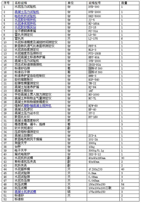 (一)專項試驗室應具備檢測水泥、砂石、外加劑、摻合料和混凝土的能力,試驗用儀器設備應按規定檢定合格,具體試驗項目和檢驗儀器設備配備應符合附件要求。